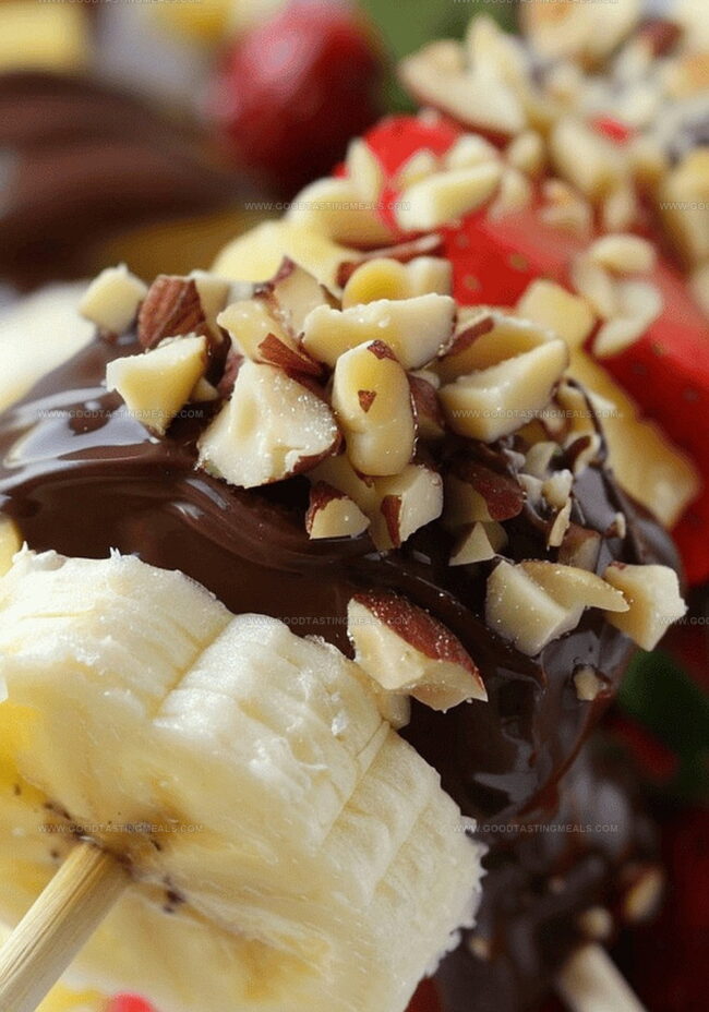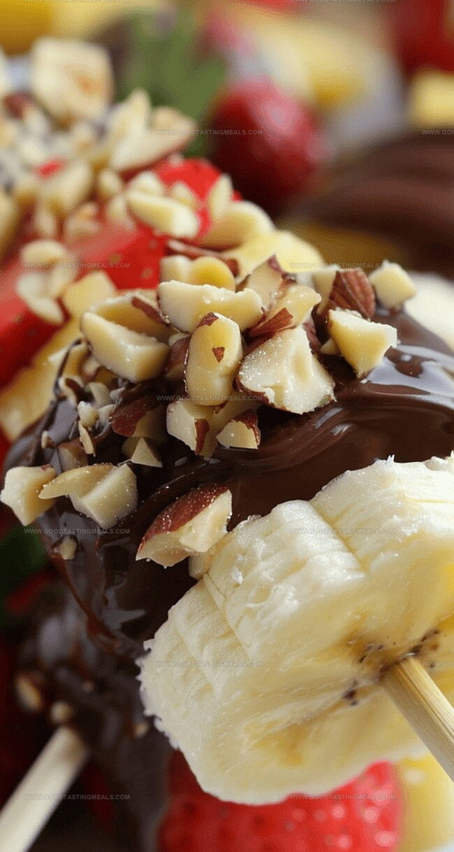 - Immediately roll the chocolate-coated skewers in the prepared chopped nuts, creating a crunchy exterior.