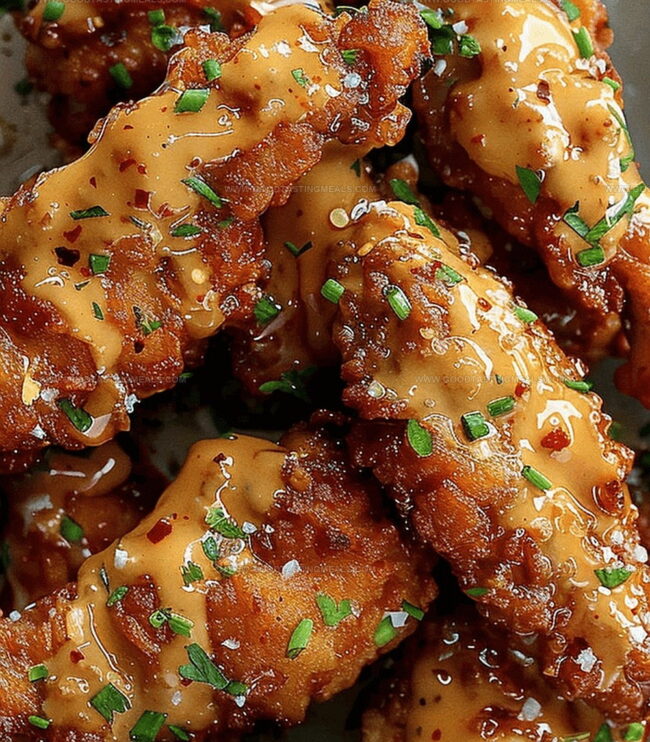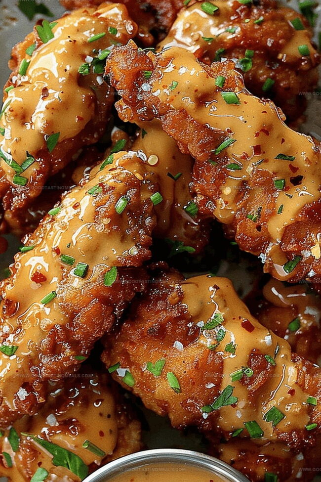 - Generously coat the crispy tenders with prepared bang bang sauce, ensuring complete coverage.