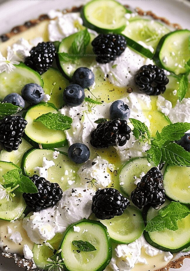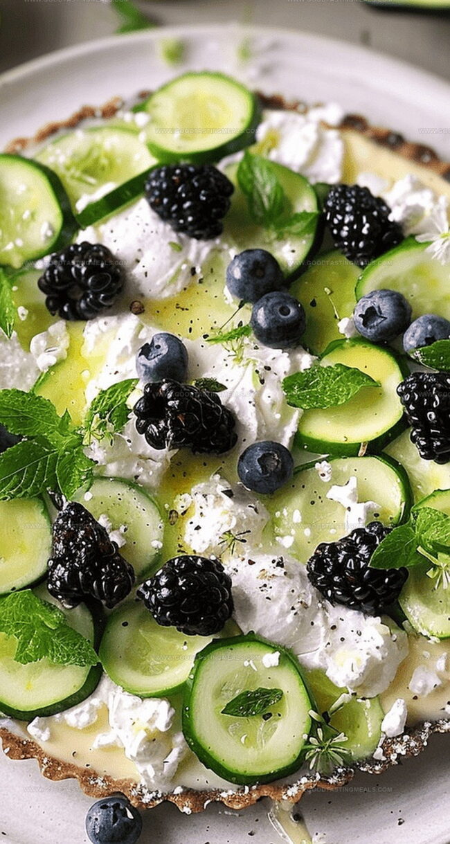 - Artfully arrange cucumber medallions, vibrant blueberries, avocado slices, deep purple blackberries, and crumbled feta cheese across the verdant arugula landscape.