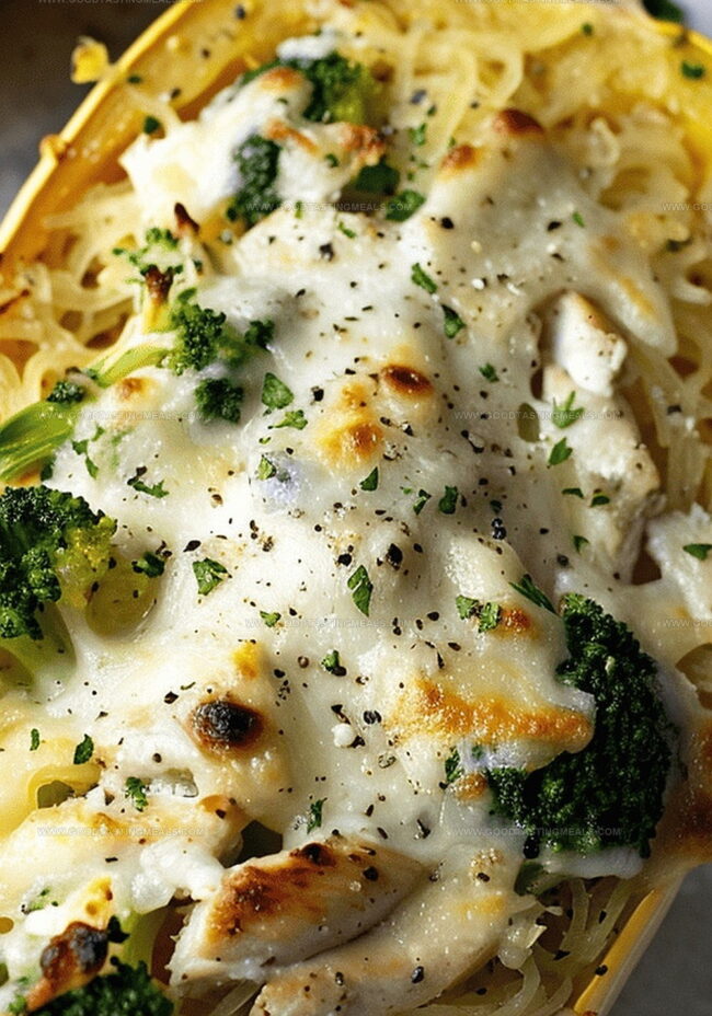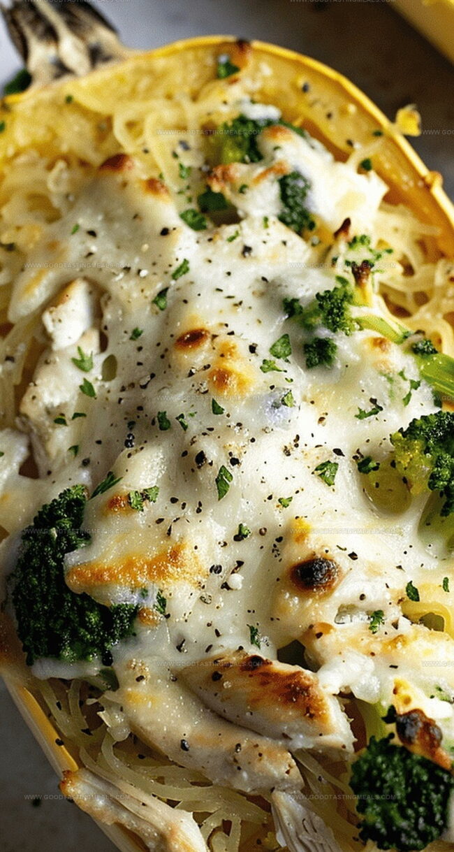 Roasted spaghetti squash becomes the perfect vessel for juicy, seasoned chicken and vibrant broccoli florets nestled inside its natural bowl.