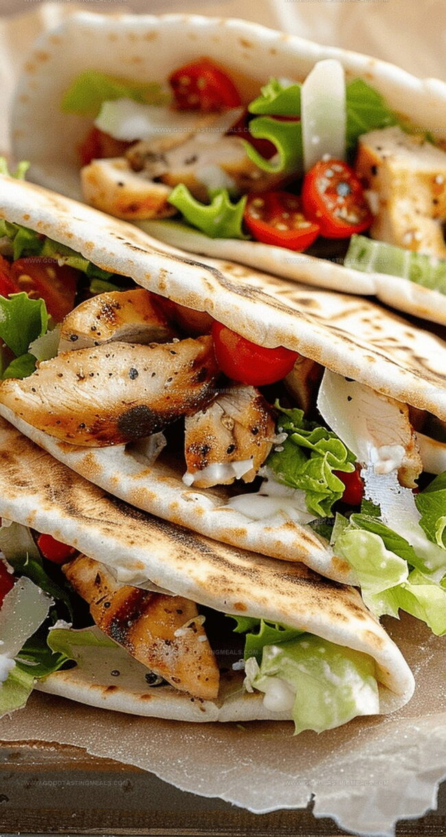 Tender chicken pieces nestle perfectly within soft, pillowy pita bread.