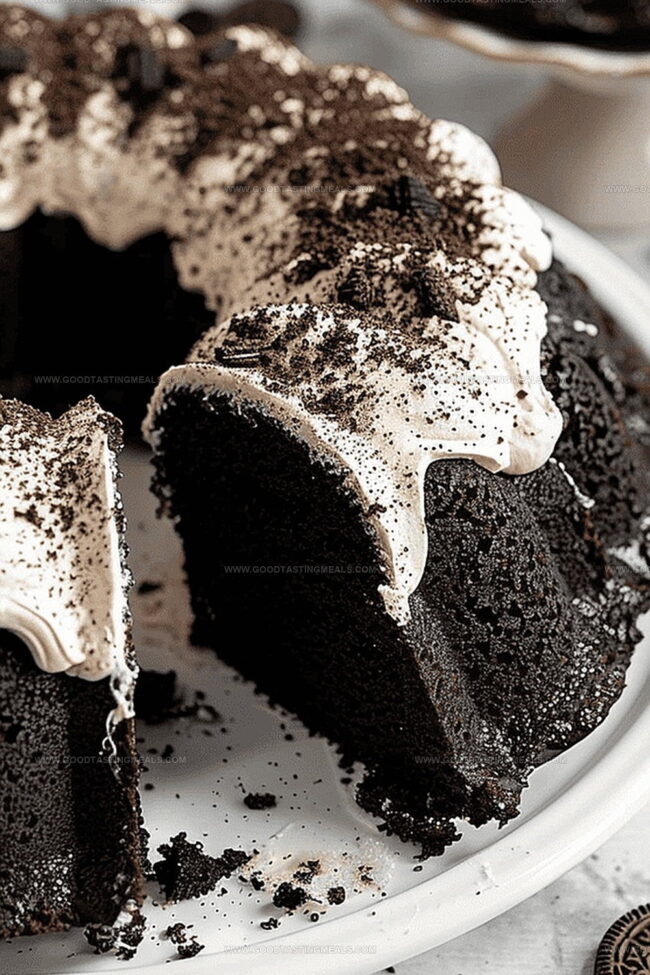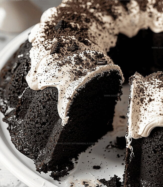 Rich chocolate bundt cake loaded with crushed Oreo cookies promises pure indulgence. Creamy cookies and cream frosting crowns this irresistible dessert, making you crave each delectable slice.