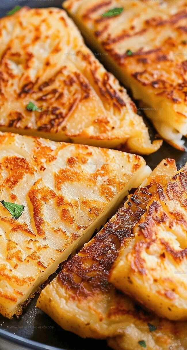 Warm a skillet with a whisper of butter and carefully place your potato triangles. Cook each side until a golden-brown crust develops, revealing a tender interior that speaks of home-cooked comfort.
