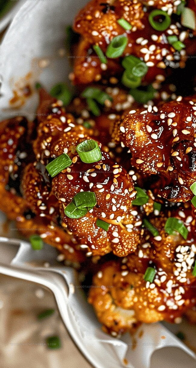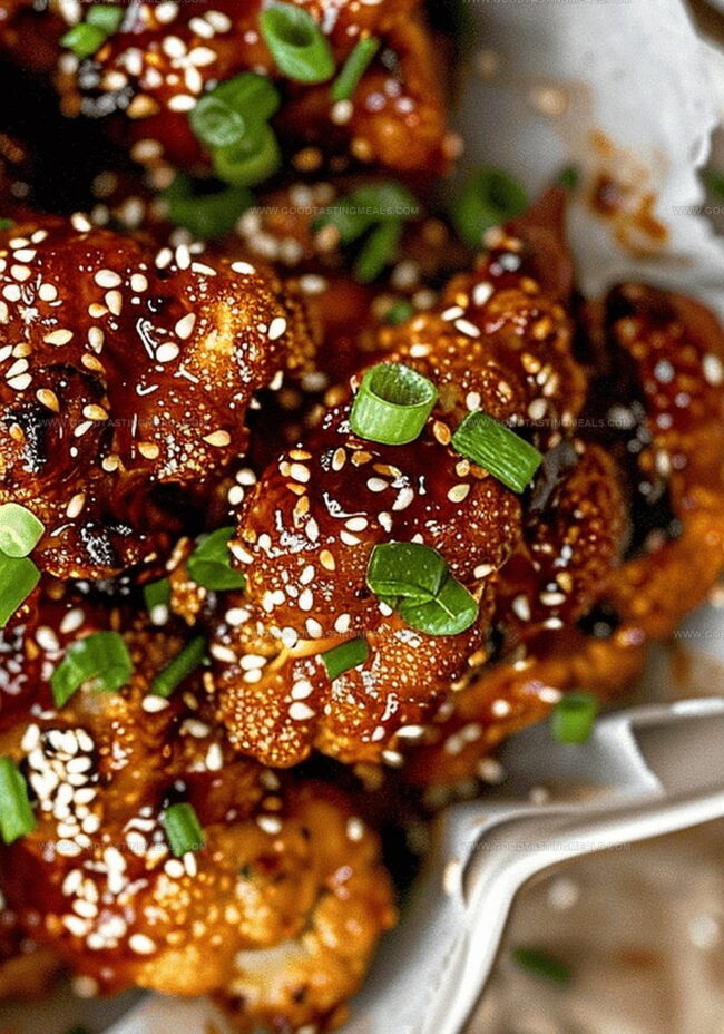 Gently toss crispy cauliflower in warm sauce, ensuring each piece gets fully coated. Sprinkle with toasted sesame seeds and fresh scallion rings for a restaurant-worthy finish.
