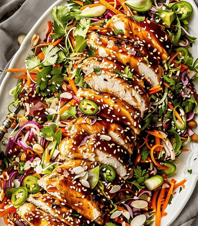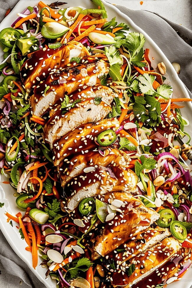 Final Composition Arrange cabbage mixture on a stunning platter, layer sliced chicken on top, sprinkle with toasted nuts, additional herbs, and a generous drizzle of dressing for a knockout culinary experience.
