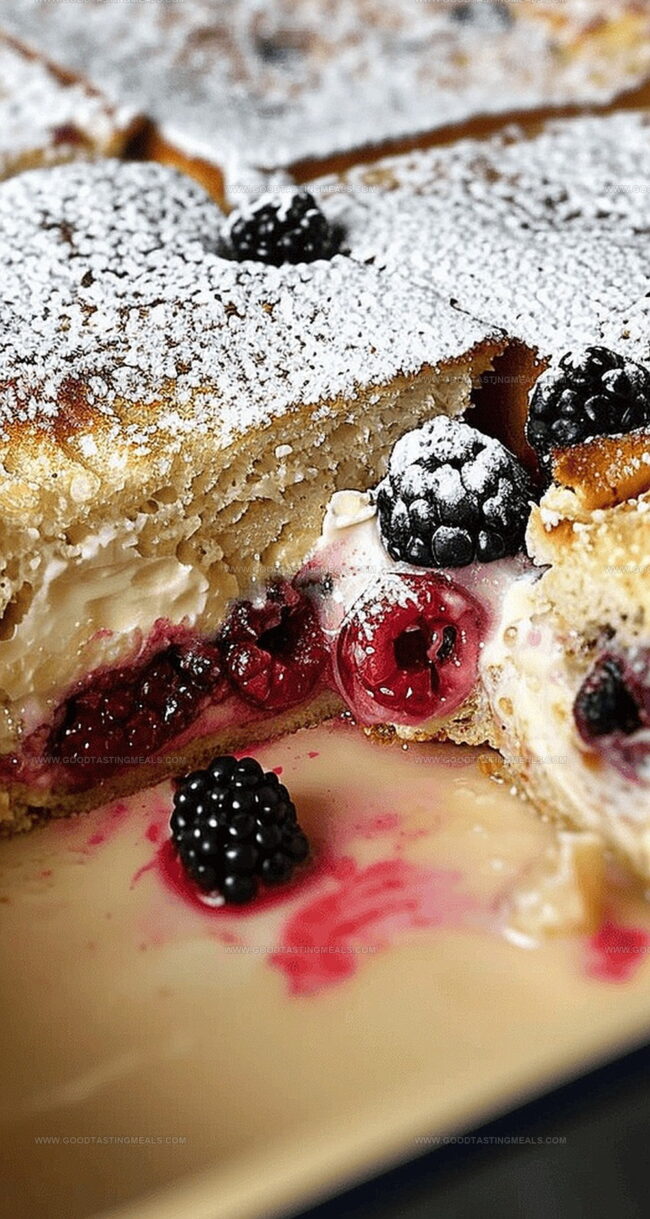 Allow the casserole to rest and settle, then dust with a delicate snowfall of powdered sugar, transforming the dish into a stunning breakfast centerpiece ready to be devoured.