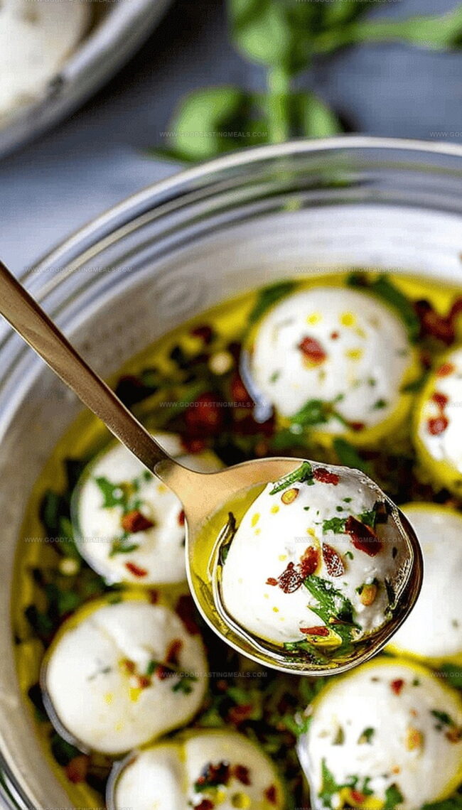 Versatile and elegant, these marinated mozzarella balls serve as a stunning addition to charcuterie boards or standalone snacks.