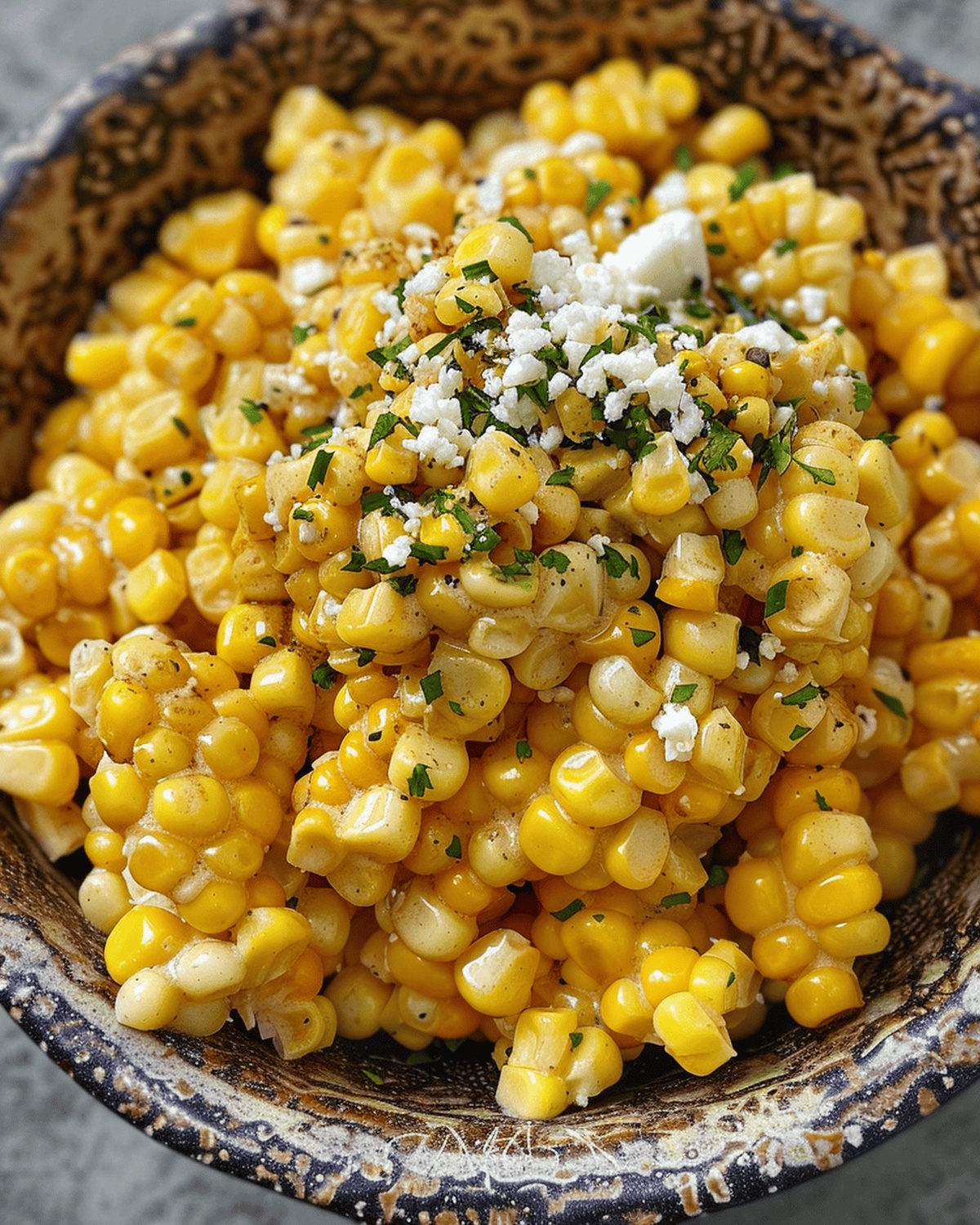 Gently mix all ingredients until corn is evenly coated. Top with crumbled cotija cheese. Enjoy warm or at room temperature as a delightful Mexican street corn salad.
