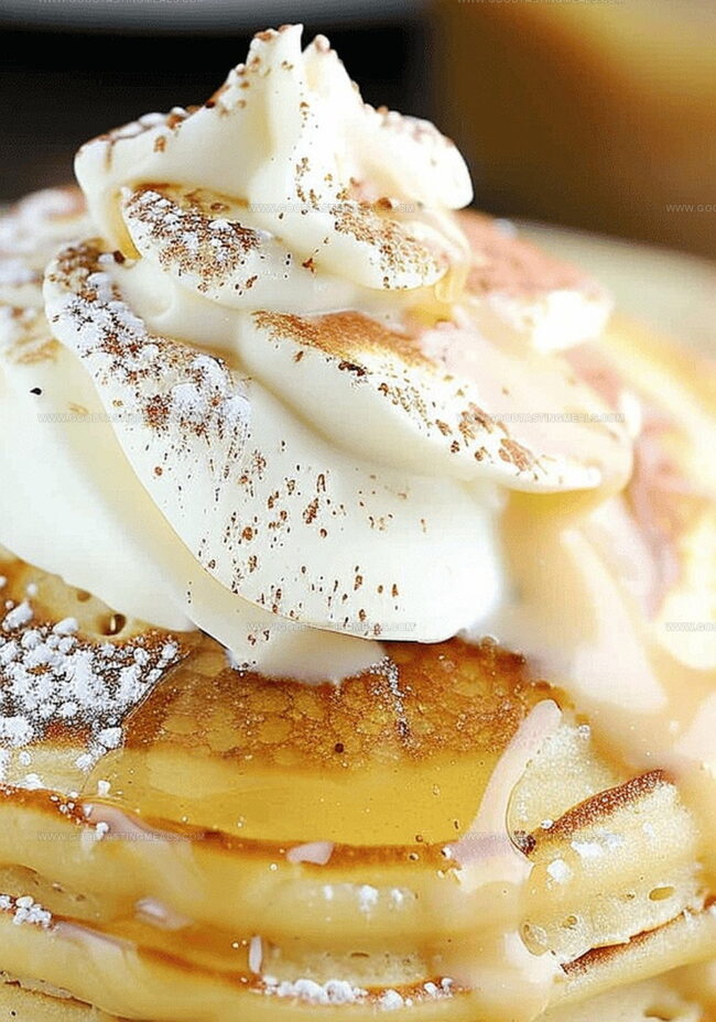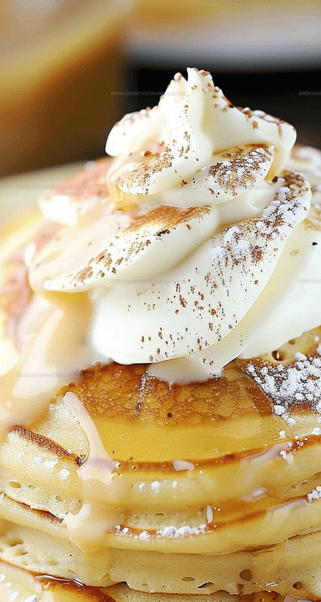 Serving Finale: Plate warm pancakes, generously drizzle with vanilla syrup, and garnish with softly whipped cream and a delicate sprinkle of ground nutmeg.