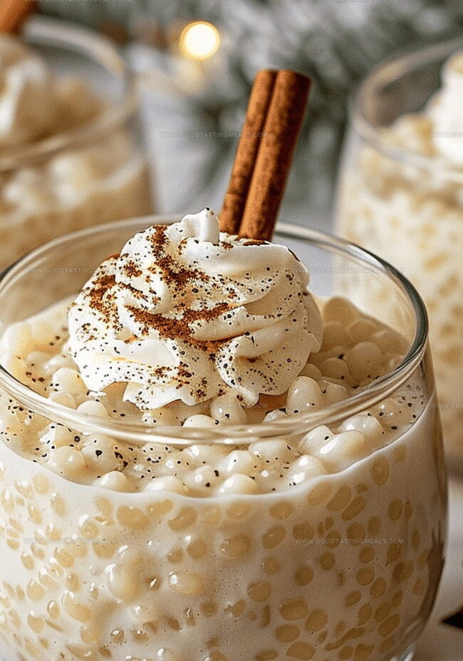Warm spices dance through creamy eggnog tapioca pudding, creating a festive dessert that whispers winter comfort.