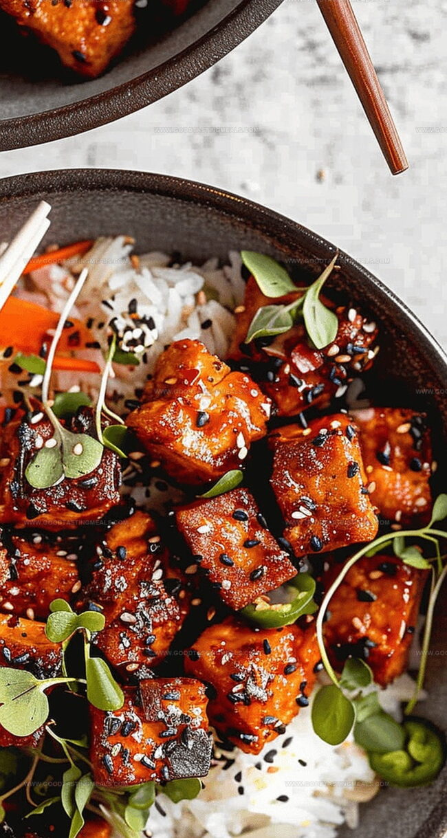 Each golden-brown tofu piece promises a tantalizing crunch that contrasts beautifully with the deep, complex gochujang marinade.