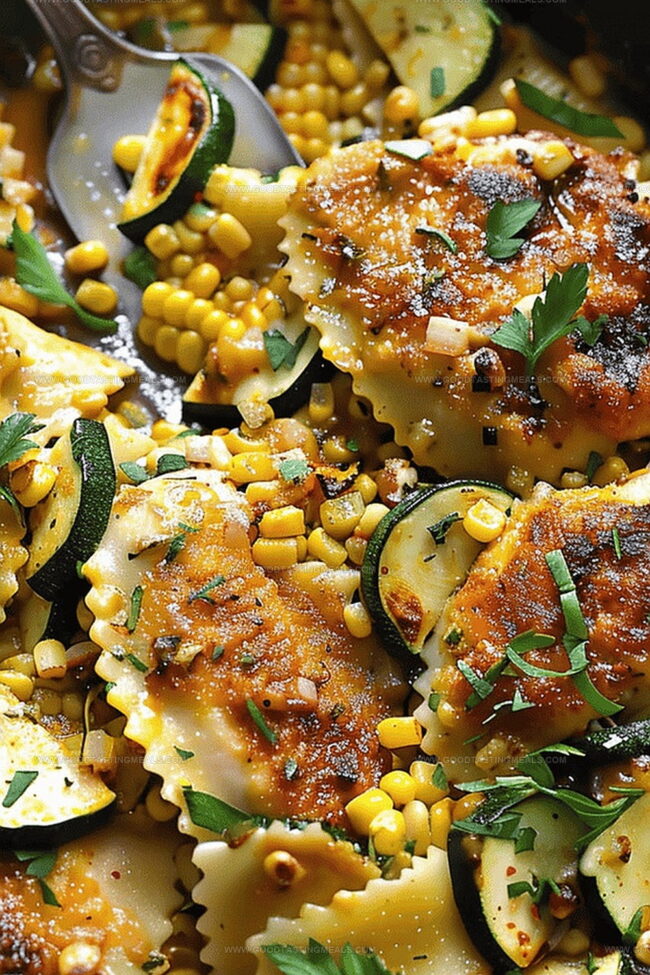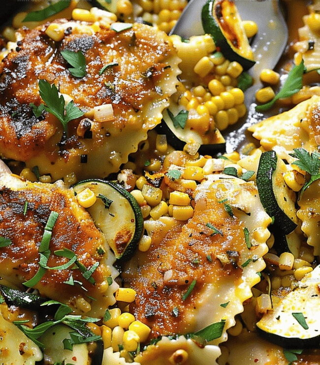Garlic butter chicken dances with zucchini, corn, and ravioli in this Mediterranean-inspired skillet masterpiece. Quick weeknight magic combines juicy chicken, seasonal vegetables, and pillowy pasta for a satisfying meal you’ll crave again and again.