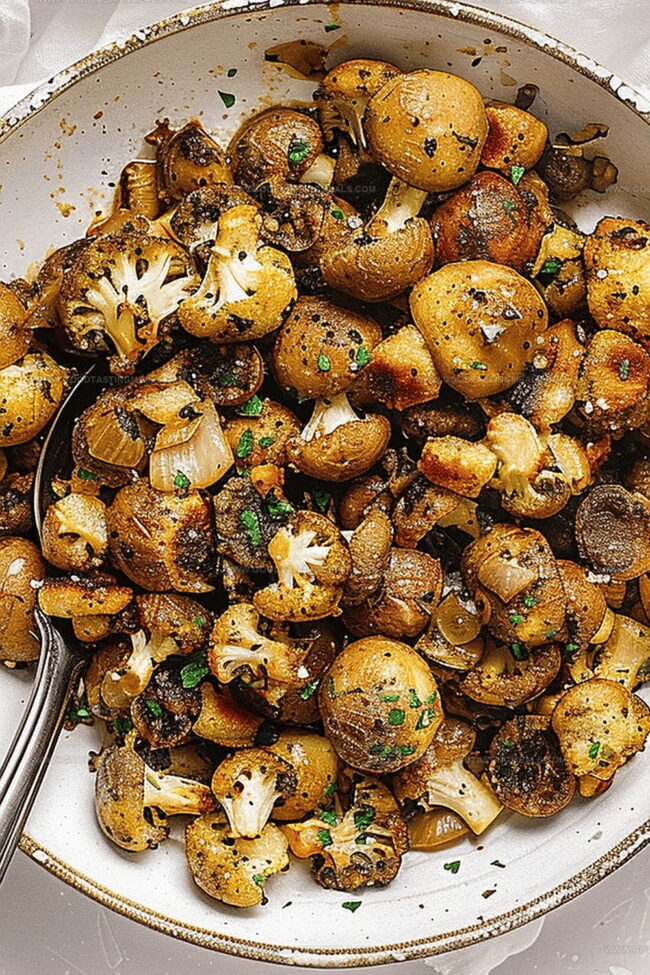 Sizzling garlic mushrooms dance with tender cauliflower in this irresistible skillet sensation that revamps humble ingredients into a mouthwatering masterpiece.