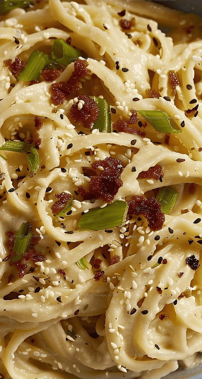 - Garnish with reserved dark green scallion tops, chili crisp, and additional sesame seeds.