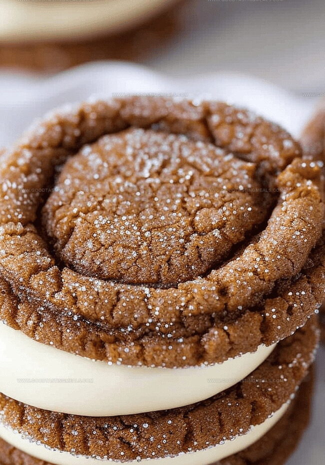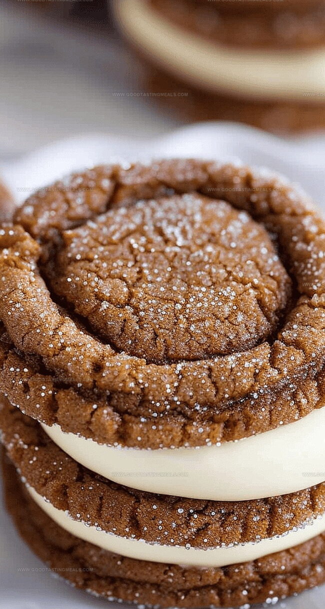 Spicy ginger molasses cookies embrace winter’s warmth with creamy eggnog frosting nestled between two perfectly spiced layers. Rich holiday flavors dance together, inviting seasonal cheer to your plate with each delightful bite.