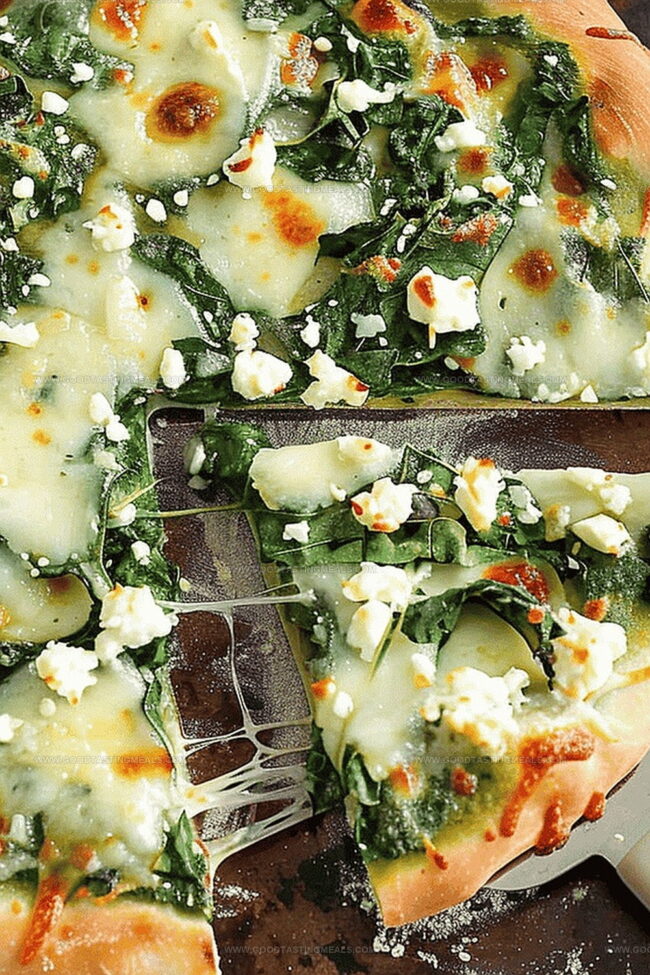 Melted cheese and vibrant pesto dance together on a crispy three cheese pesto spinach flatbread pizza that promises a flavor explosion.