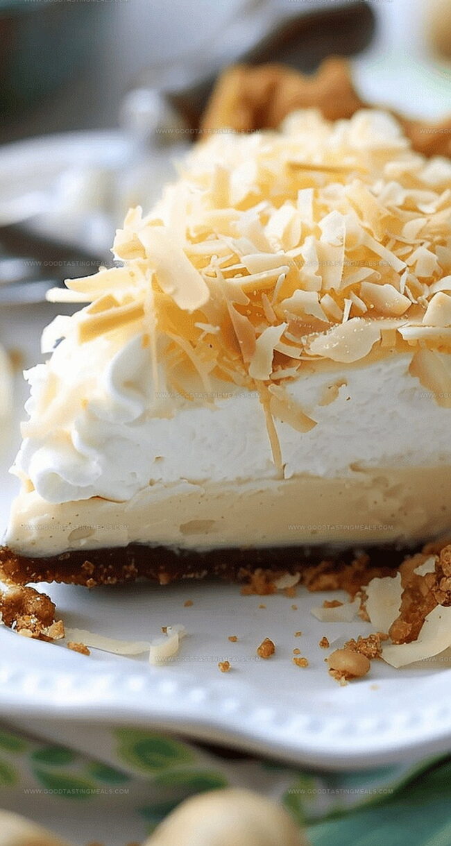 - Before serving, generously top the pie with whipped cream and sprinkle with toasted coconut shavings.
