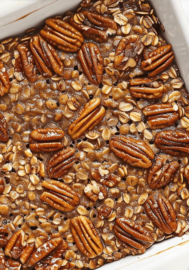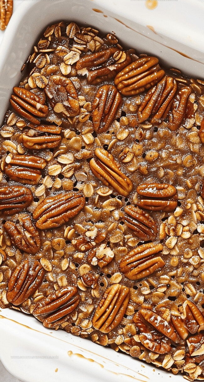 Layer and Bake: Drizzle the pecan mixture over the oatmeal base, distributing it uniformly, then bake in the preheated oven for 35-40 minutes until golden-brown and set.
