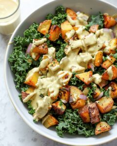 Hearty spicy potato kale bowls showcase Mediterranean-inspired comfort through layered plant-based goodness. Robust flavors combine with creamy mustard tahini dressing, offering you a nourishing meal that satisfies completely.