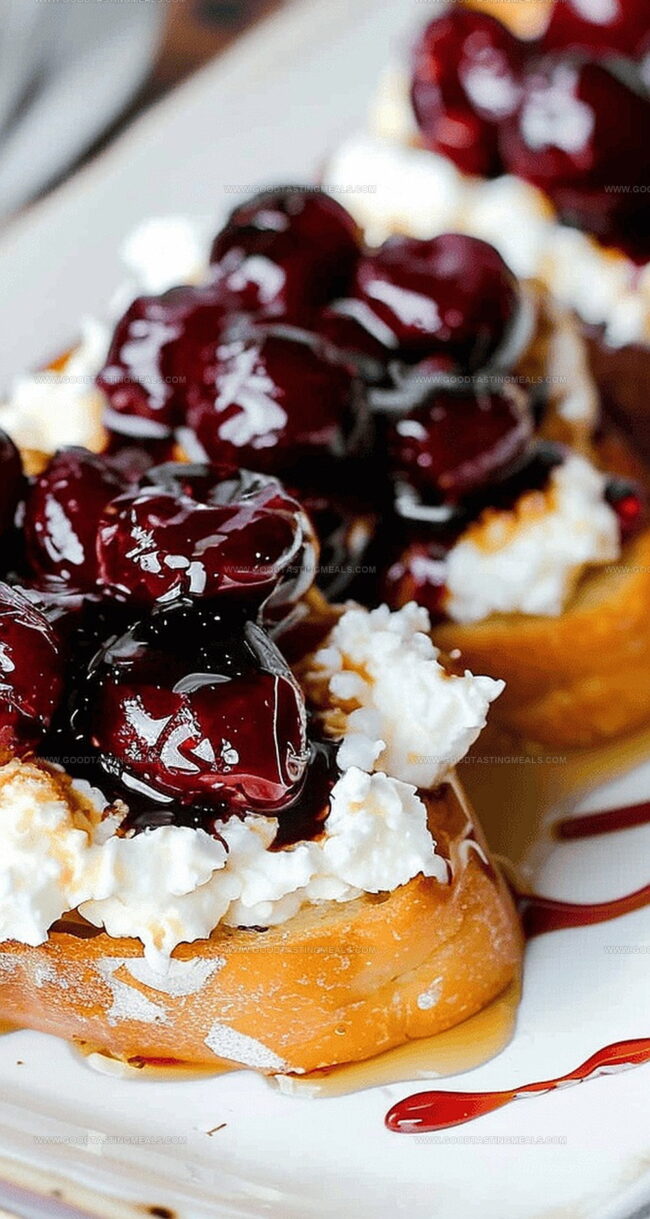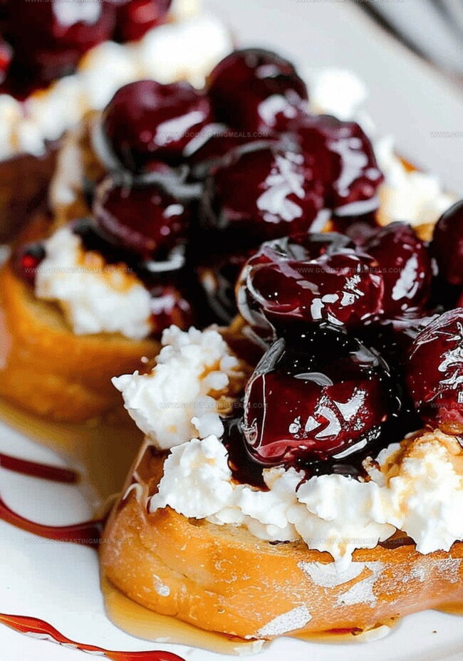 Honey roasted cherries mingle with creamy ricotta on perfectly toasted bread, creating a luxurious breakfast experience. Sweet and tangy notes dance across crisp edges, offering a delightful Mediterranean-inspired morning treat you’ll savor with pure pleasure.