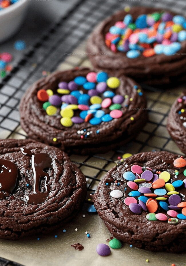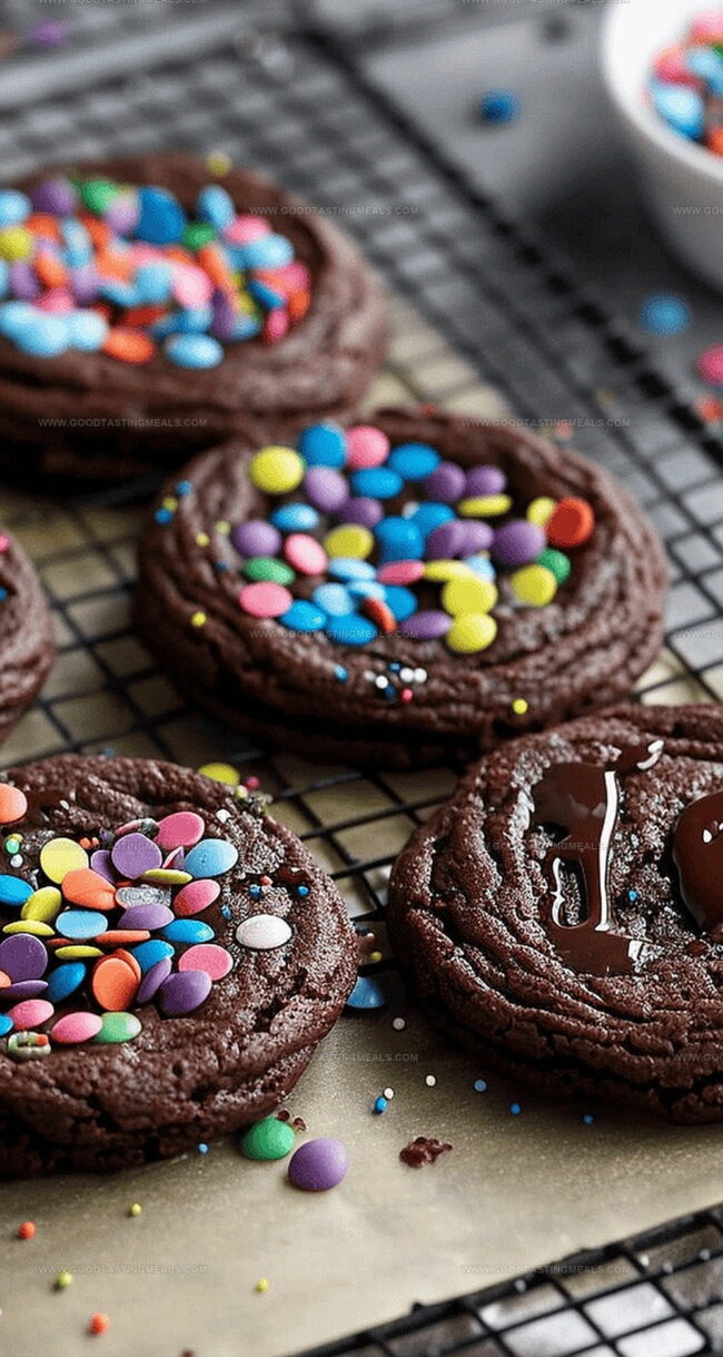 Rich chocolate ganache nestles inside homemade cosmic brownie cookies, creating an indulgent dessert reminiscent of childhood treat memories. Sprinkled rainbow chips add playful color and nostalgic charm that you’ll savor with pure delight.