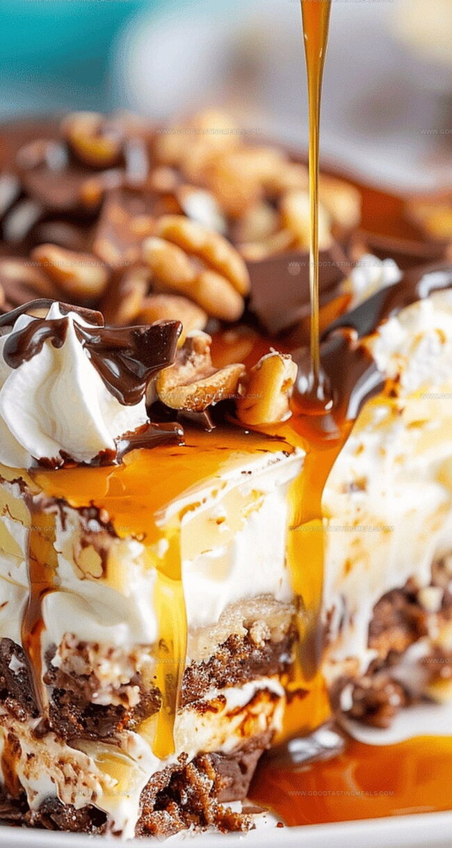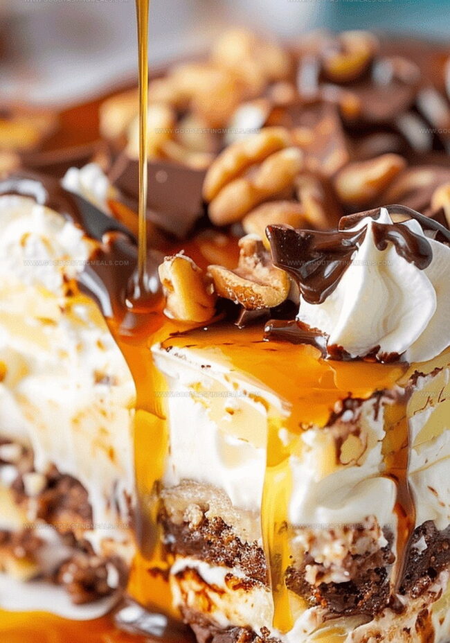 - Sauce and Nut Layering: Artfully drizzle half the caramel and hot fudge sauces, ensuring comprehensive coverage. Generously scatter chopped pecans over the sauced layer.