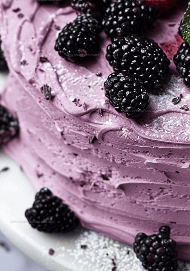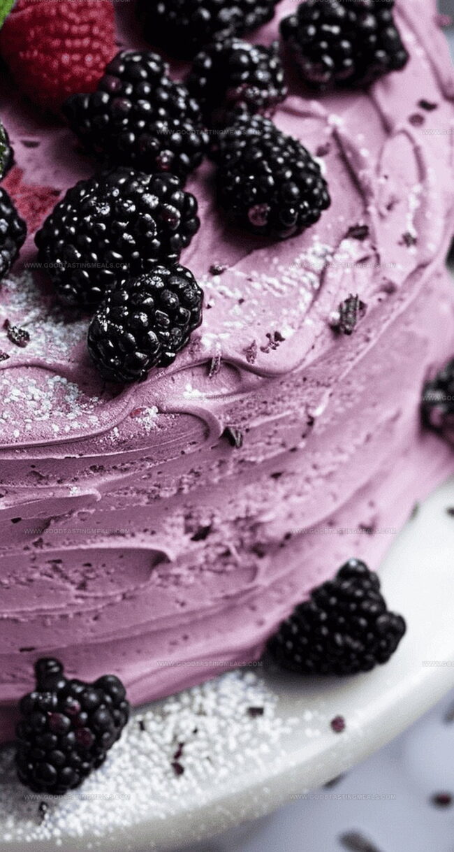 Once cooled, stack cake layers with luxurious blackberry buttercream between each level, coating the entire masterpiece in creamy decadence.
