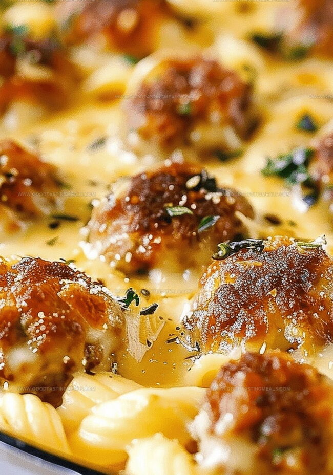 - Fold pasta into cheese sauce, ensuring thorough coating. Transfer mixture to a baking dish and nestle broiled meatballs throughout.