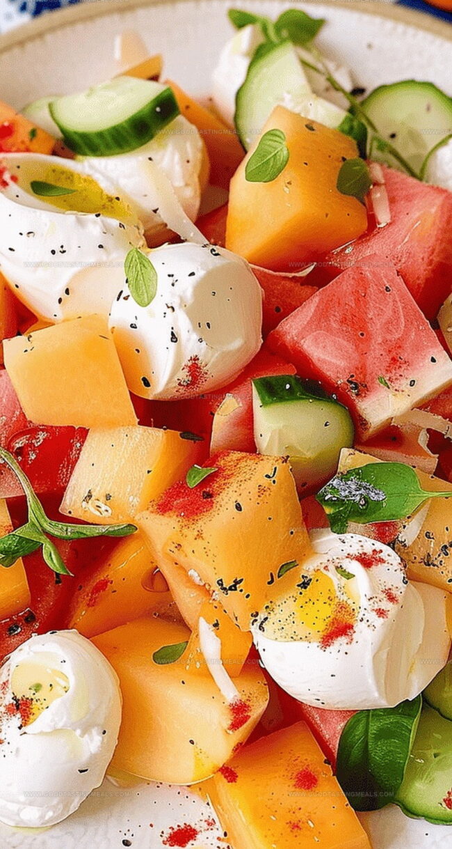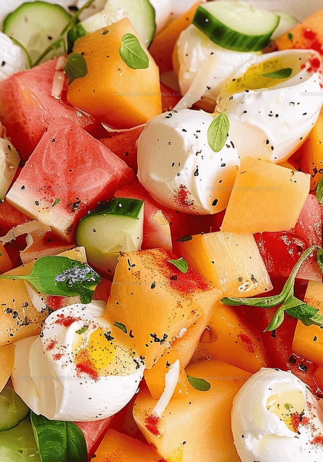 Vibrant melon and mozzarella salad bursts with summer’s refreshing essence, capturing the pure delight of seasonal ingredients.