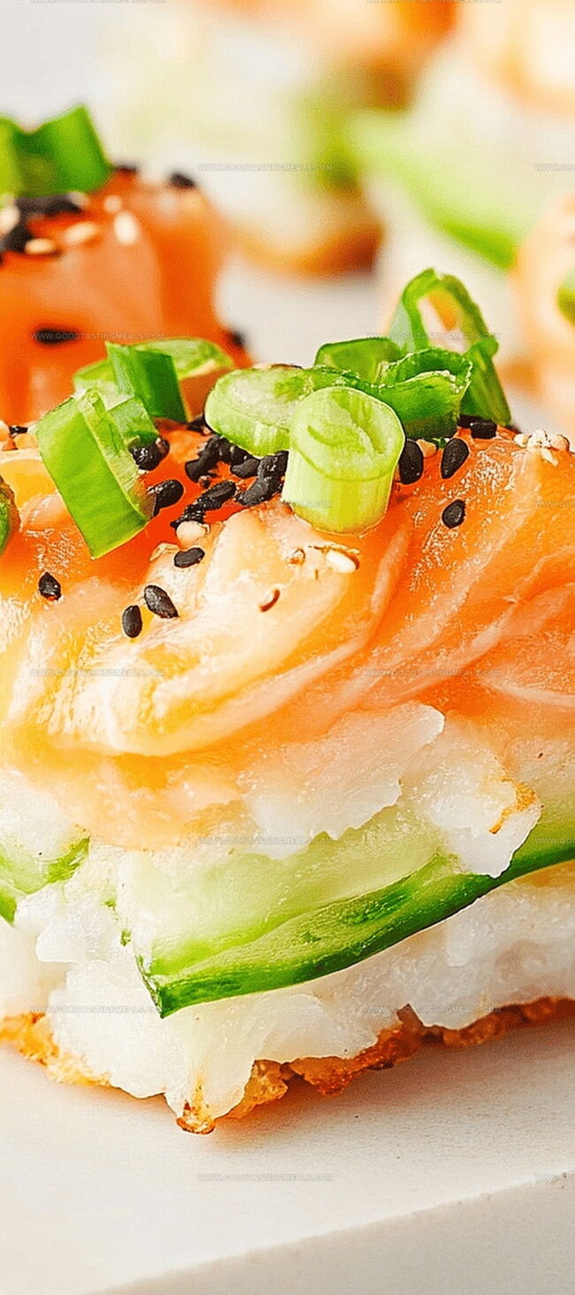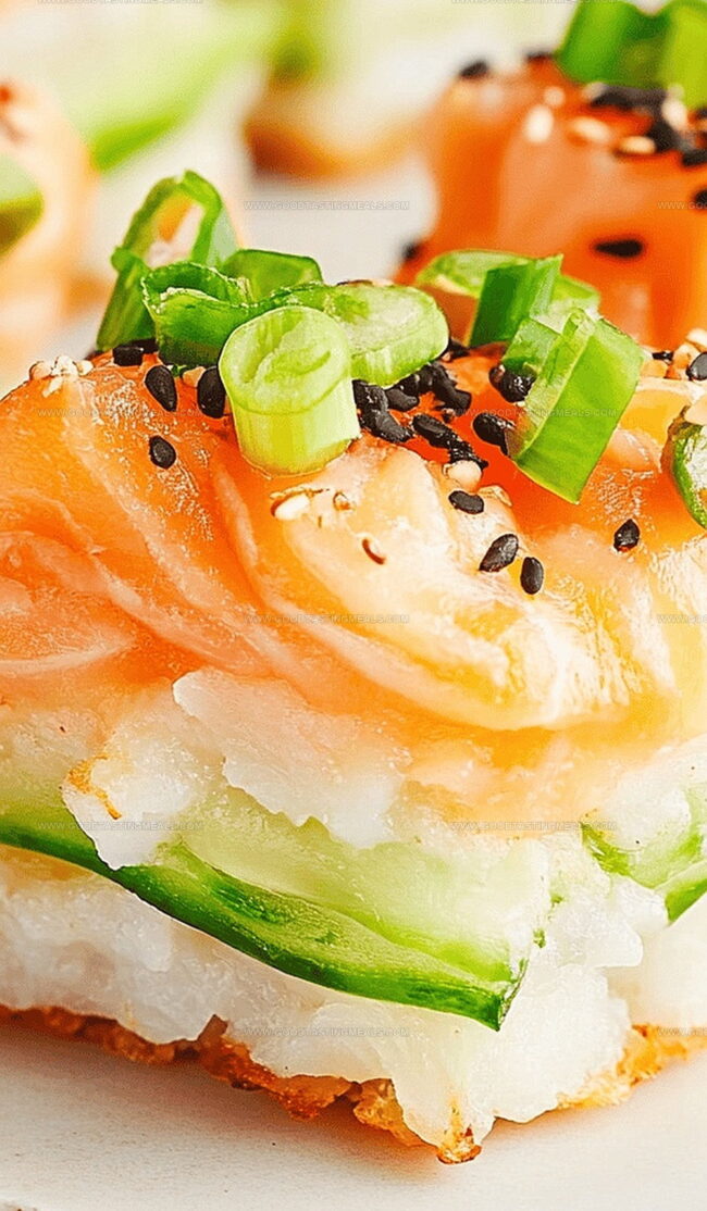 Layer cucumber slices and salmon mixture atop each crispy rice piece. Sprinkle with toasted sesame seeds and delicate green onion for a restaurant-quality presentation that delights both eyes and palate.