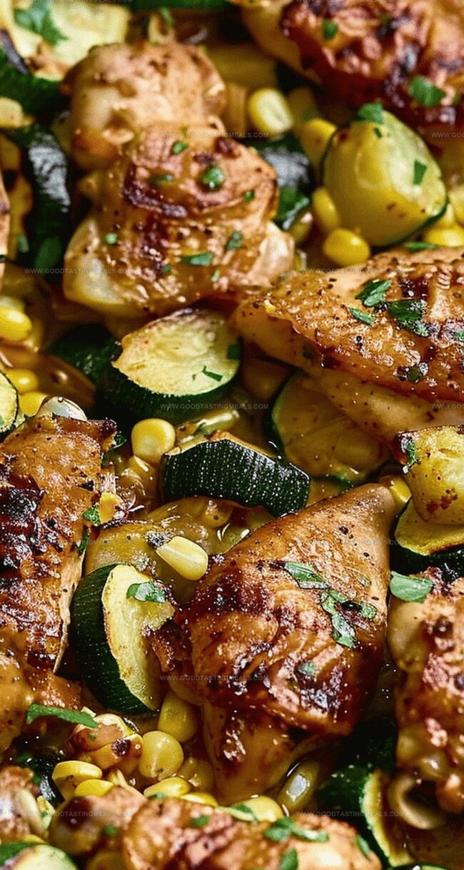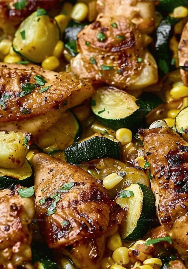 Savor summer’s bounty with this one-pan chicken featuring charred corn and zucchini, a rustic dish celebrating seasonal freshness. Juicy chicken mingles with caramelized vegetables, creating a simple yet irresistible meal you’ll crave again and again.