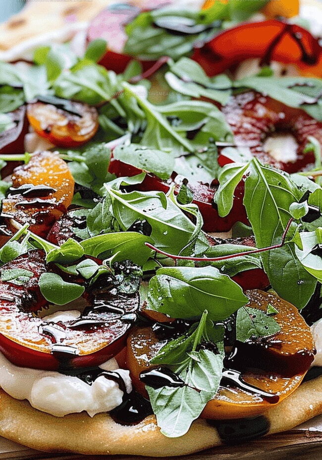 - Scatter fresh baby arugula and torn basil leaves across the flatbread, adding vibrant color and herbaceous notes.