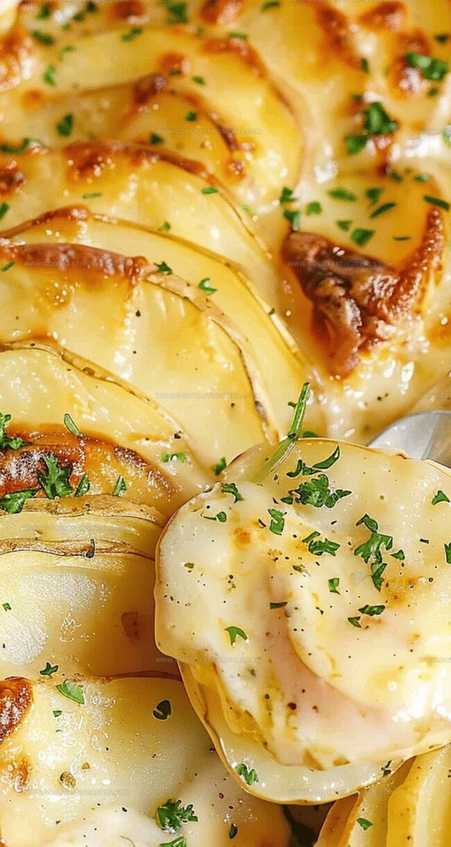 Layers of thinly sliced potatoes promise a comforting experience that speaks directly to hunger and heart.