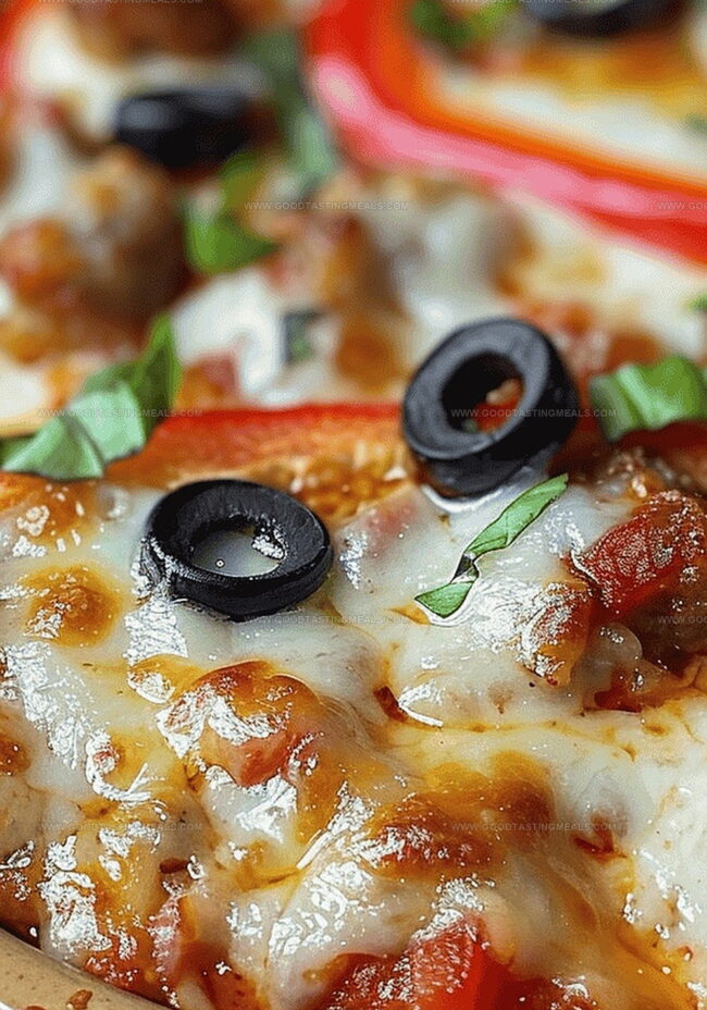 Scatter vibrant bell peppers, salty olives, sweet onions, and savory sausage or pepperoni across the surface, transforming the dish into a carnival of textures and tastes.