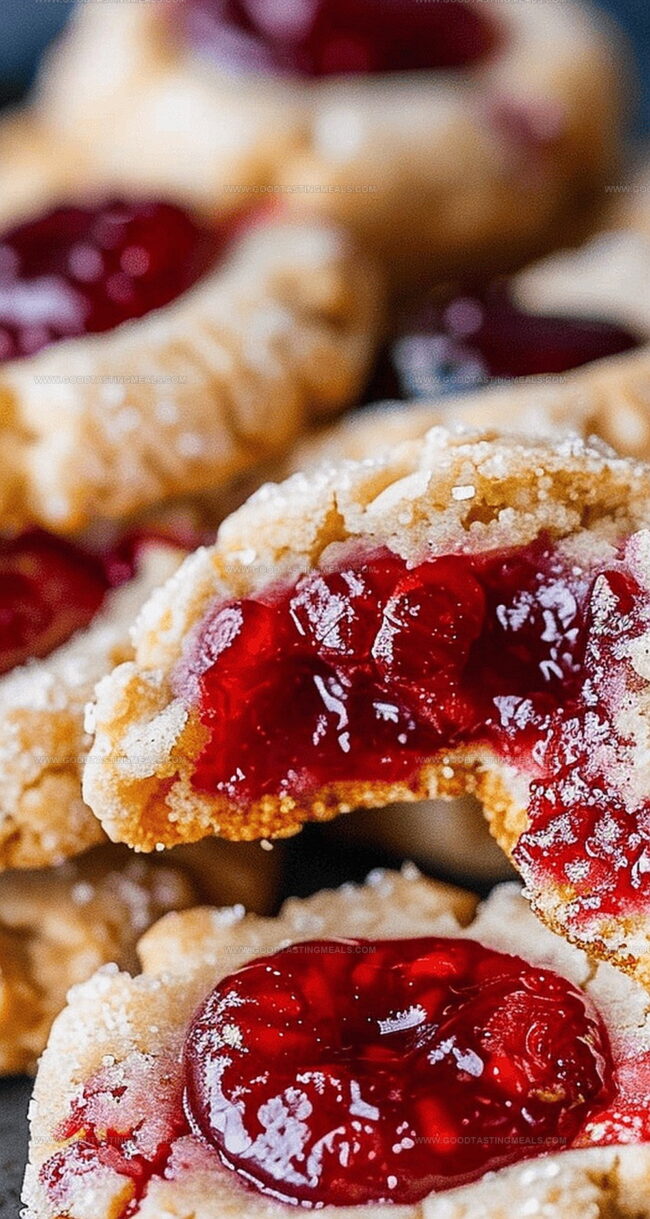 Delicate cookie dough crafts into golden-edged morsels with a glistening ruby center that beckons taste buds.