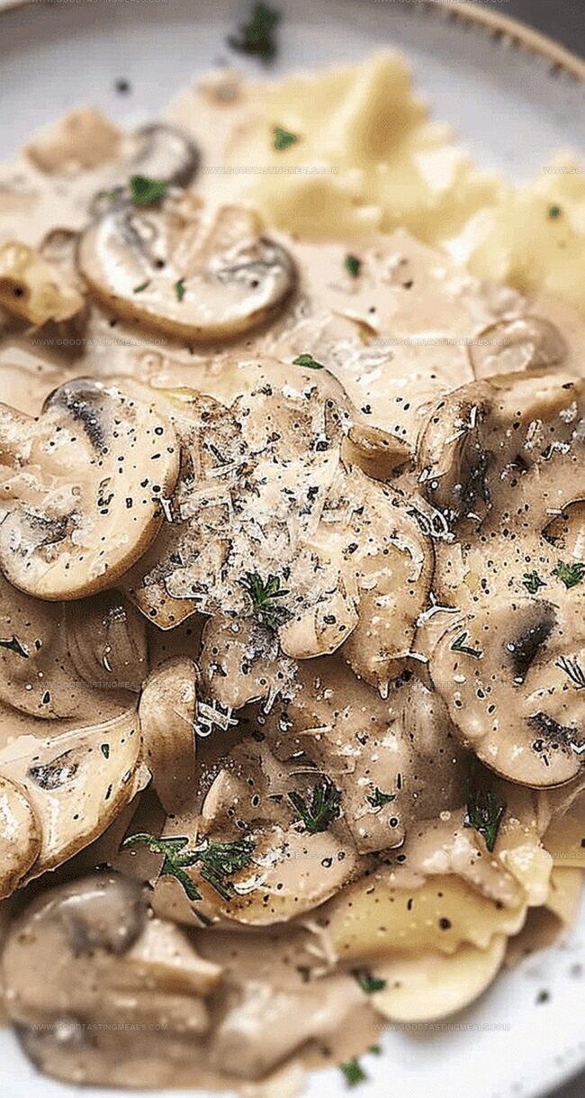 Gently fold cooked ravioli into the creamy mushroom sauce, ensuring each pasta pillow is lovingly coated.
