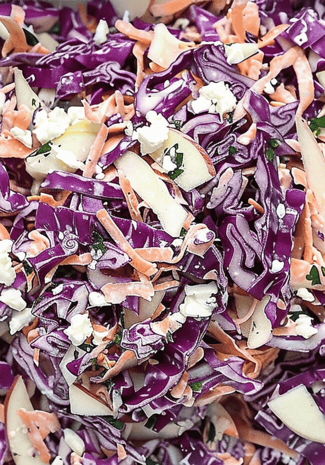 German-inspired red cabbage coleslaw brings zesty crunch to your plate with crisp apple and sharp parmesan. Creamy yet tangy, this refreshing salad offers a perfect balance of flavors that elevate any meal.