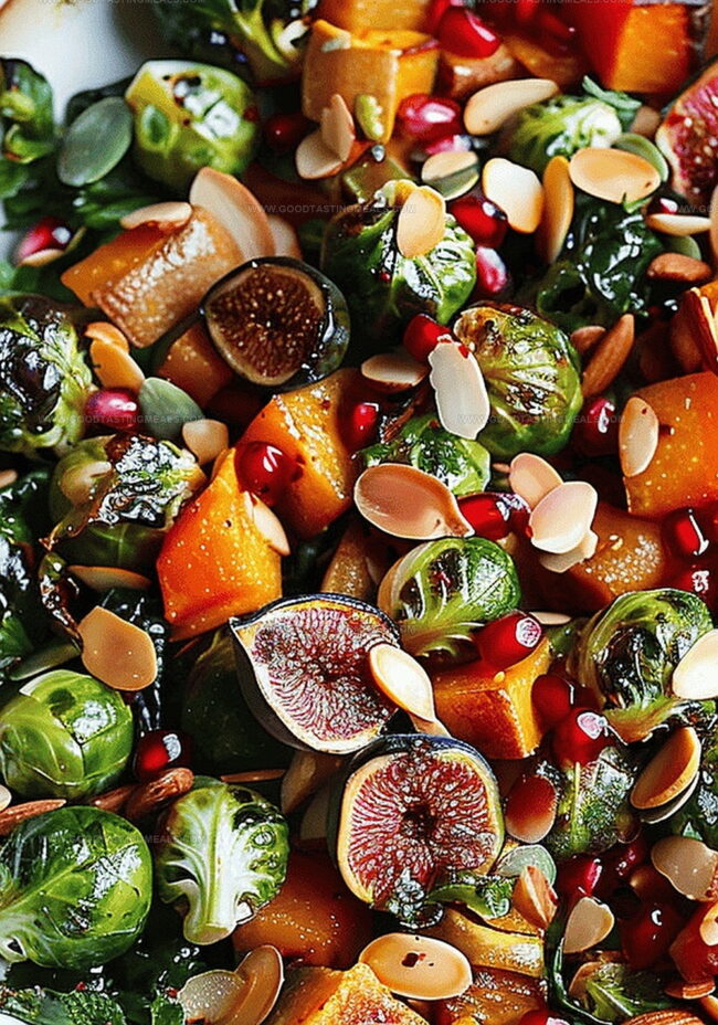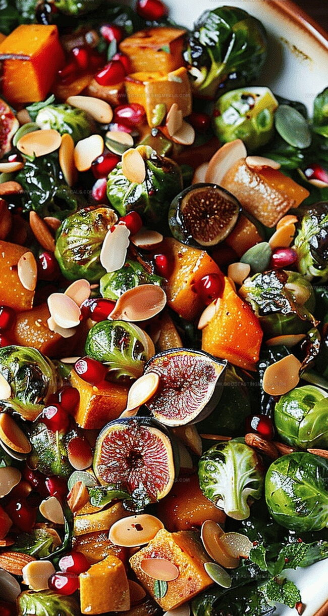 - In a large serving bowl, combine roasted Brussels sprouts and butternut squash, gently mixing with chopped dried figs.