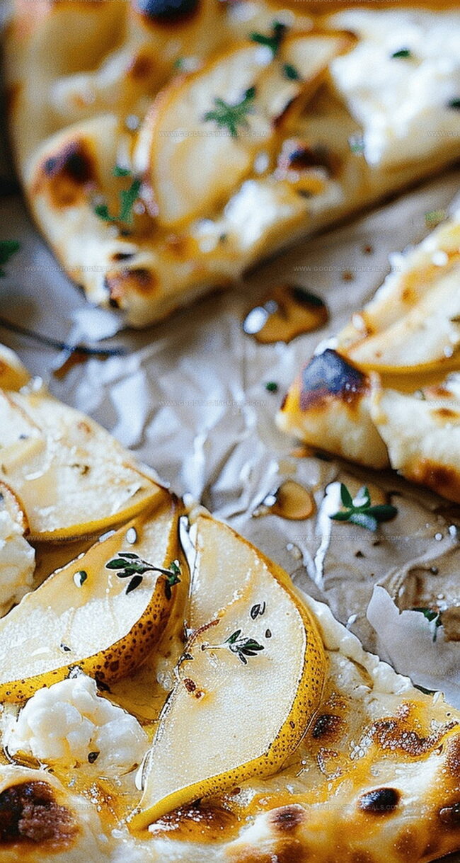 Delicate slices of ripe pear nestle atop golden naan bread, creating a canvas of deliciousness.