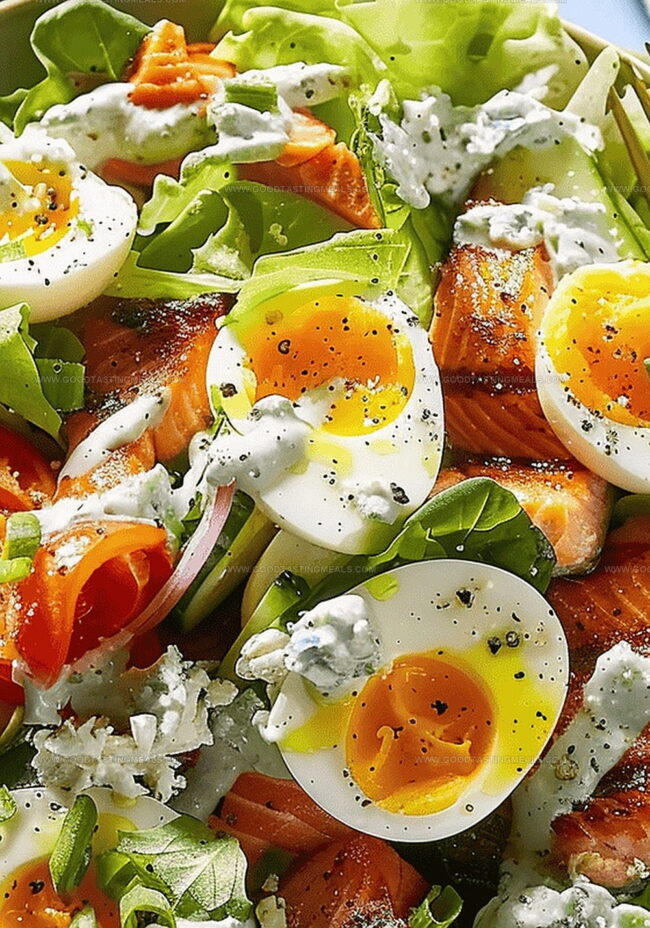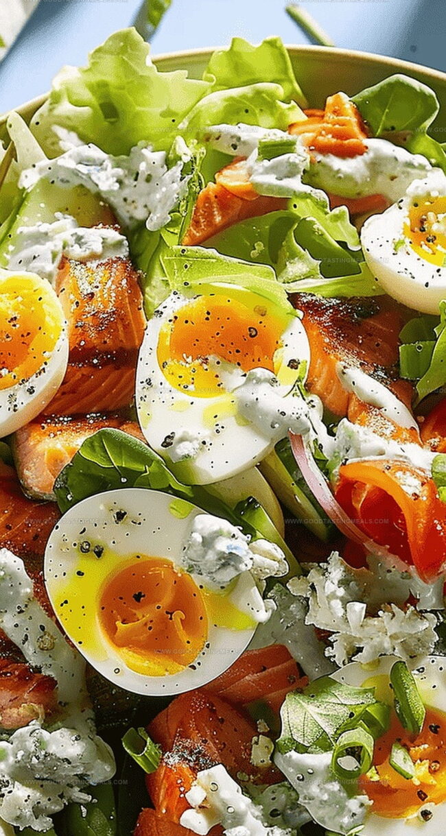 Creamy salmon cobb salad brings Mediterranean coastal charm to your plate. Fresh Pacific salmon nestles among crisp greens, eggs, bacon, and tangy blue cheese, creating a protein-packed lunch you’ll crave again and again.