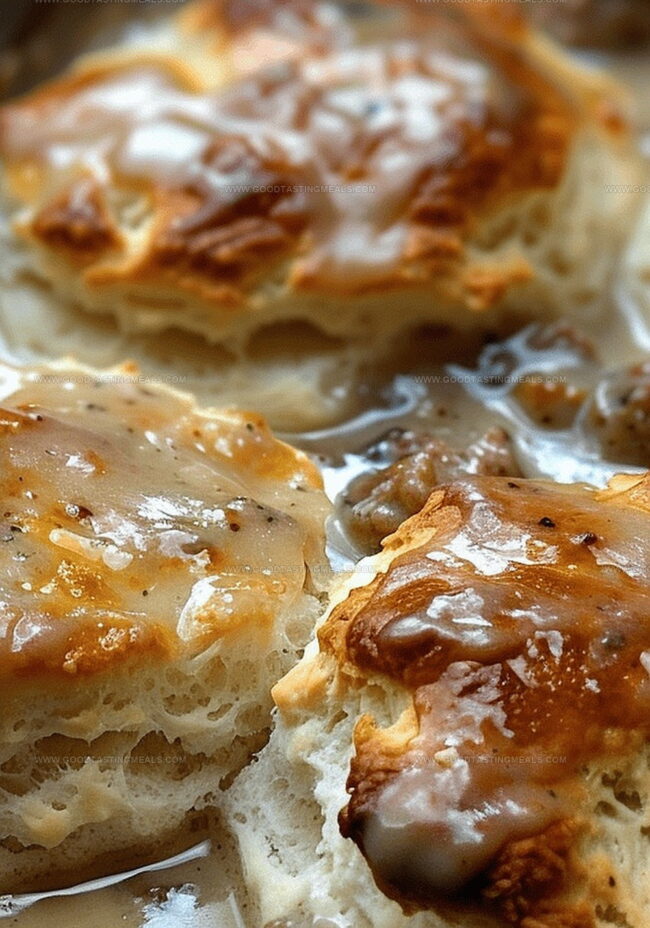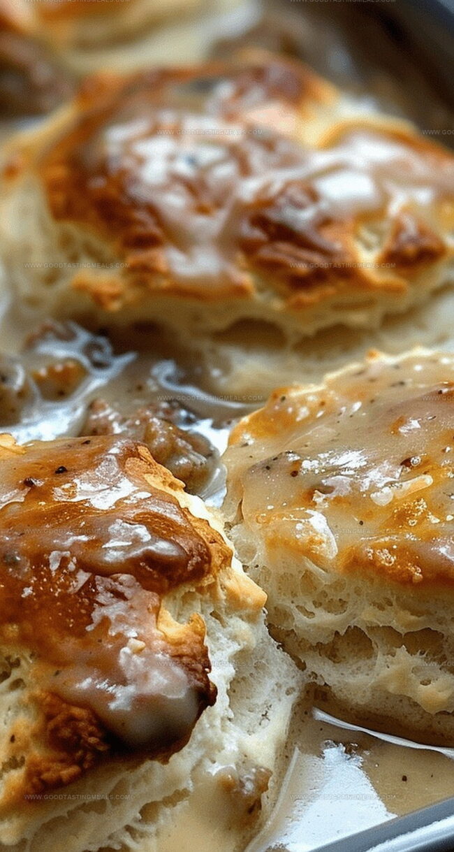 - Generously cascade the sausage-studded gravy over the biscuits, ensuring each piece is thoroughly coated.