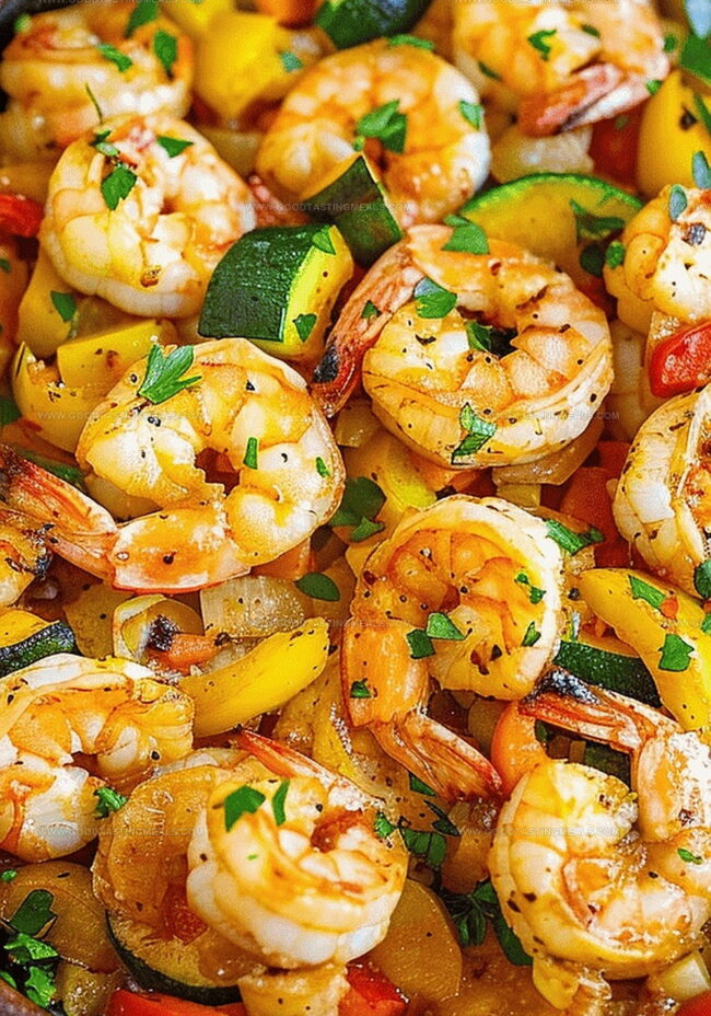 Sprinkle freshly chopped parsley over the skillet for a burst of color and added freshness. Serve immediately and enjoy the delightful combination of spicy shrimp and tender vegetables.