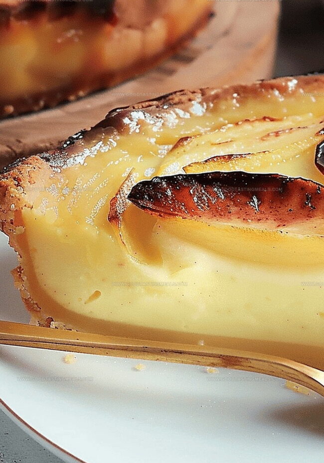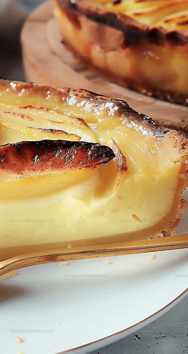 A delightful French-inspired dessert featuring a silky smooth custard base with delicate apple slices creating a beautiful rustic design.
