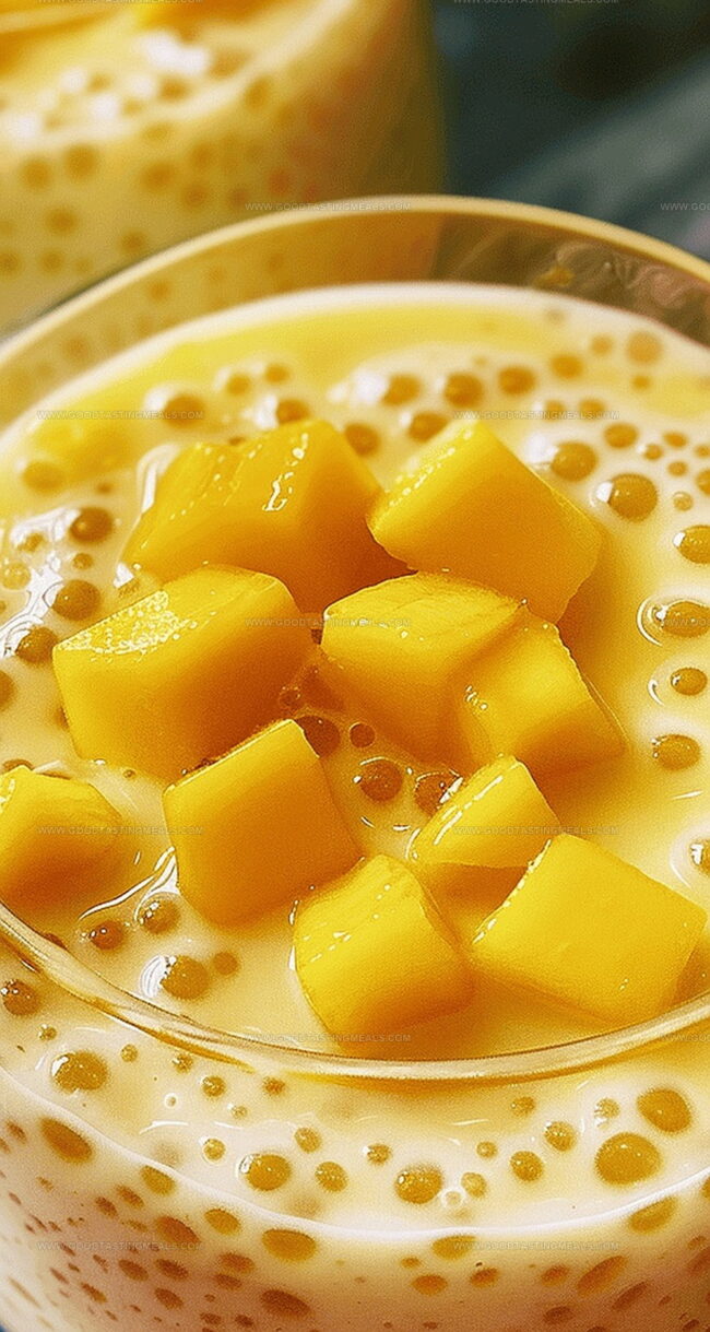 sago pearls add a playful, chewy dimension to the smooth mango base, creating a perfect balance of textures.
