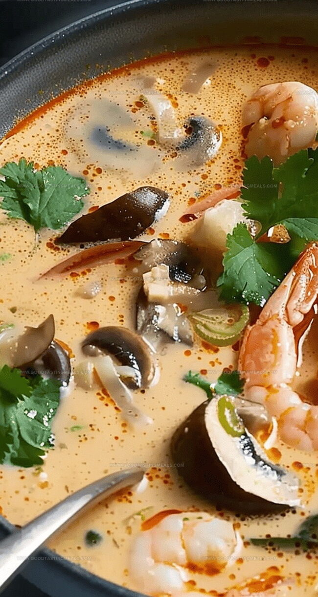 Creamy Thai coconut soup blends aromatic herbs with silky coconut milk for a comforting experience. Spicy, tangy flavors dance together, promising warmth and satisfaction for those seeking authentic Southeast Asian cuisine.