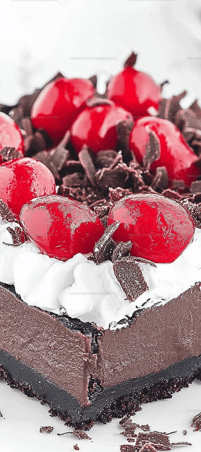 Slice into elegant bars, revealing layers of chocolate, cream, and cherry that promise a delightful sensory journey with each bite.