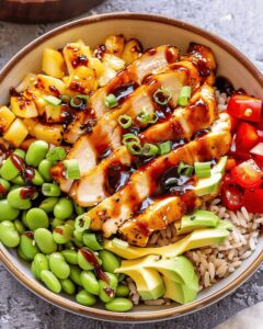 Layer fluffy brown rice as the foundation in serving bowls. Arrange sliced chicken, grilled pineapple chunks, roasted peppers, and bright green edamame on top. Drizzle with the glossy teriyaki sauce. Sprinkle fresh green onions for a final burst of flavor.