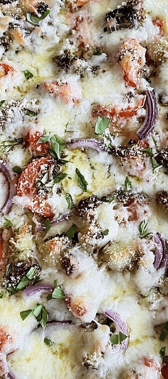 Drizzle marinara sauce across the veggie terrain. Dust the parmesan mixture over top, creating a flavor-packed layer. Dot with cherry tomatoes, red onion slices, and a generous blanket of mozzarella. A final olive oil drizzle adds shine.