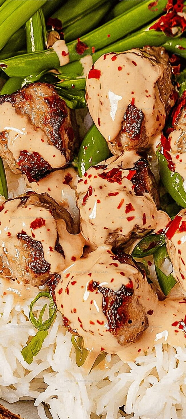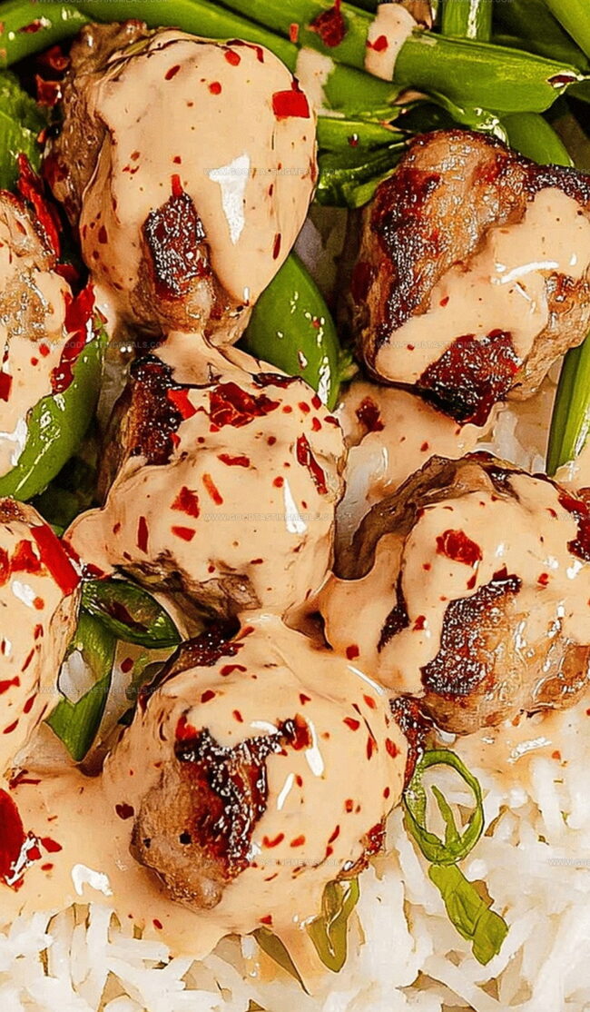 - Plating Finale: Layer coconut rice in serving bowls. Top with roasted meatballs and green beans. Drizzle generously with firecracker sauce. Garnish with scallion greens, additional sesame seeds, red pepper flakes, or chili crunch.