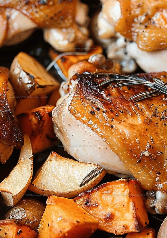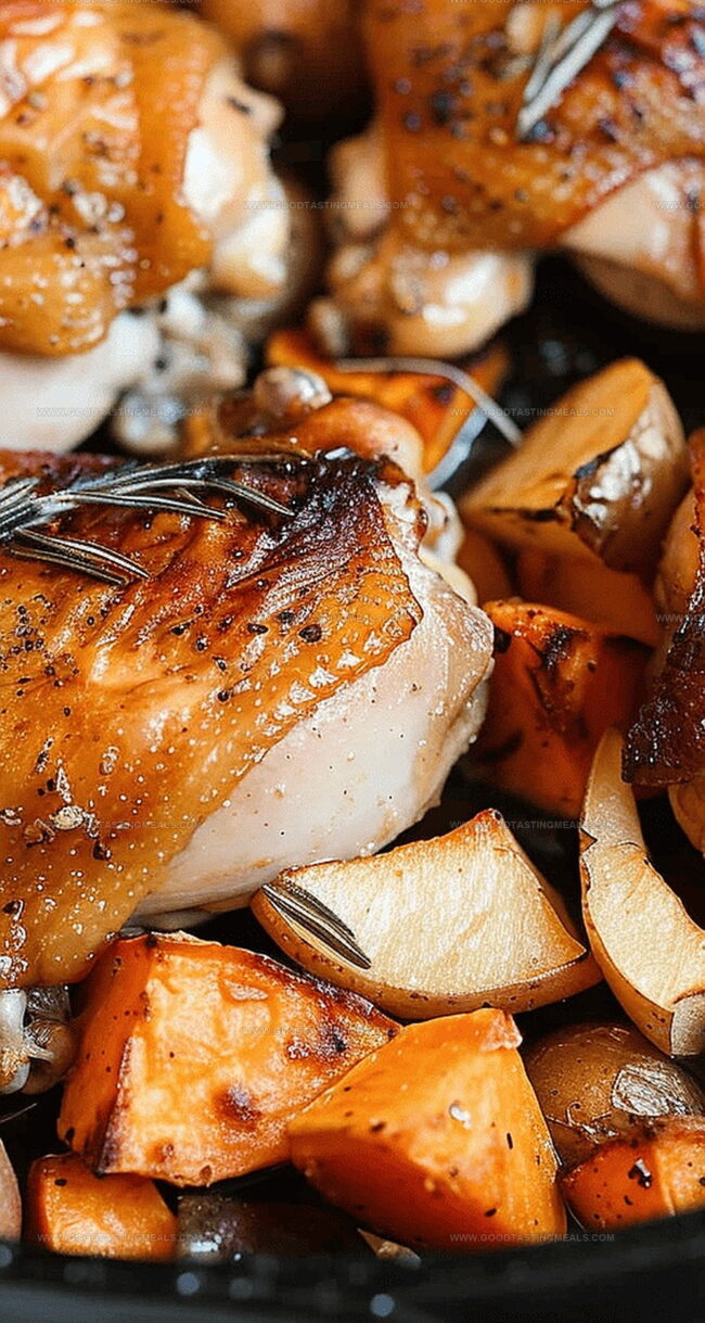 Golden-brown chicken captures the essence of autumn’s warmth, nestled alongside caramelized sweet potatoes and tender apple slices.